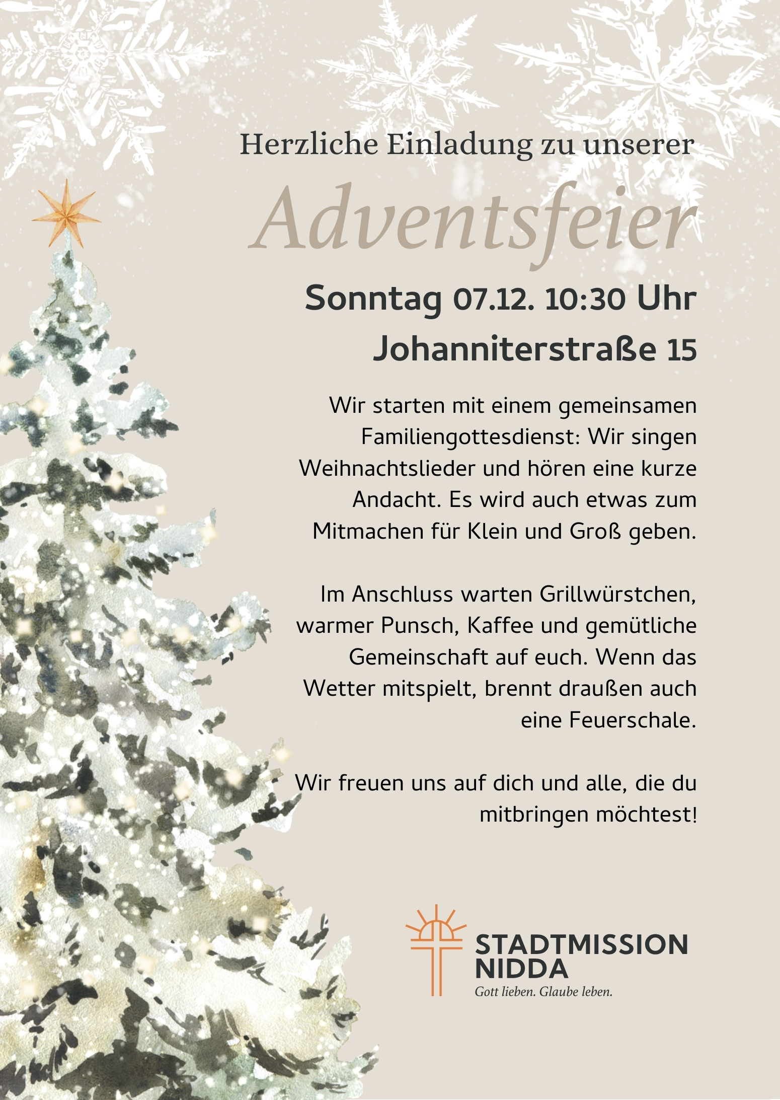 Am Sonntag den 07.12. feiern wir zusammen Advent! Wir beginnen um 10:30 Uhr mit einem Familiengottesdienst: Gemeinsam singen wir Weihnachtslieder, hören eine kurze Andacht und haben eine kleine Mitmachaktion für Kinder und Erwachsene.