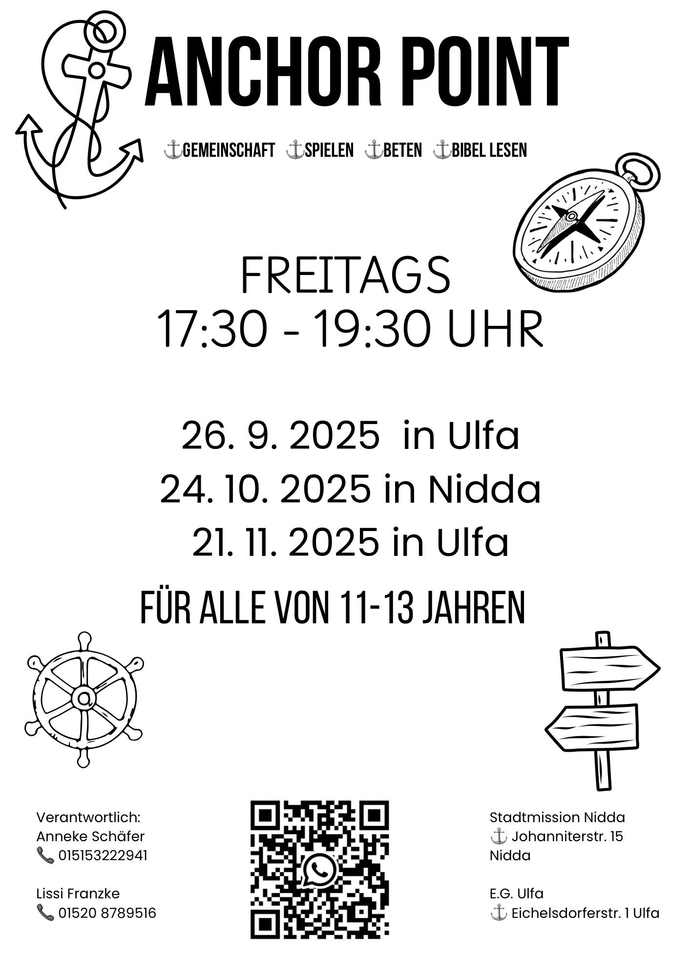 Wir sind der Anchor Point, unser Treffen für alle von 11 bis 13 Jahren. Wir erleben Gemeinschaft, spielen, beten und lesen in der Bibel.